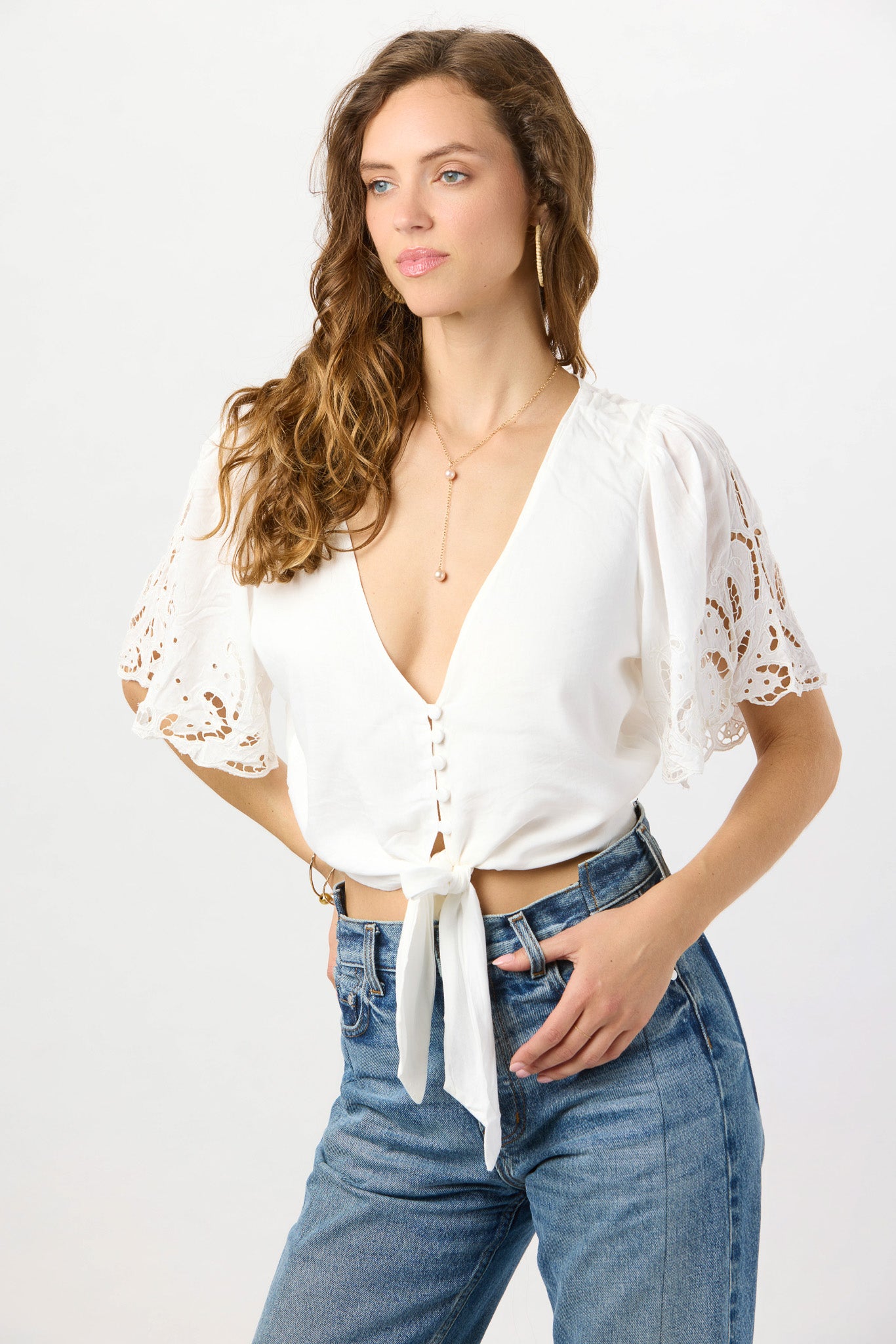Delicate craftsmanship meets breezy style in this slightly cropped top, featuring a charming front tie and fabric-covered button-down front. Designed with short, flowy sleeves and adorned with hand-embroidered, hand-cut eyelet details, this piece brings artisanal beauty to everyday wear. Lightweight and feminine, it’s perfect for pairing with high-waisted jeans, skirts, or shorts for a look that’s effortlessly romantic and uniquely refined.