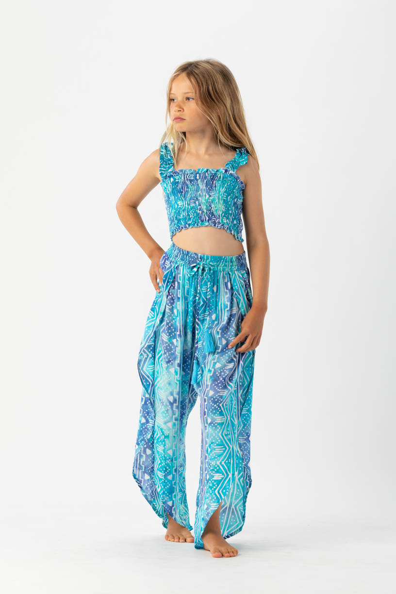 Our popular crop top paired with our Shoreline Pant to create the ultimate set...now available for your little one! Textured woven rayon fabric shapes this darling top with a square neckline, smocked bodice, cropped hem, perfectly compliments the elastic waistband and billowing legs of the Shoreline Pants. The Angelina and Shoreline Pant Set were designed to go with you wherever dreams take you.