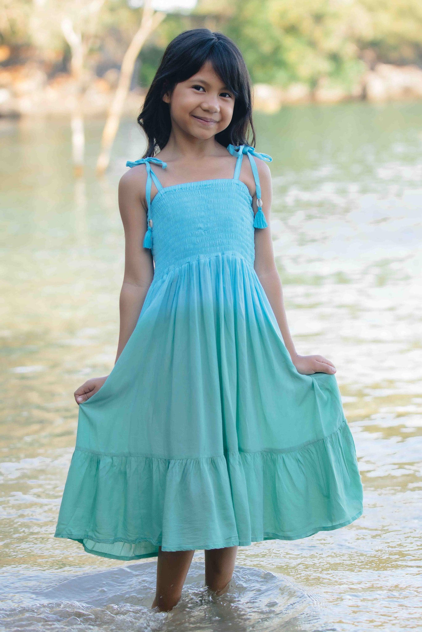 Perfect for little adventurers on sunny getaways, this charming dress features a smocked bodice for a comfy, flexible fit. Shoulder straps tie with playful tassel details that add a fun, whimsical touch. The ruffle panel at the hem gives just the right amount of twirl-ready flair—ideal for beach days, poolside fun, or exploring tropical gardens. Light, breezy, and full of vacation magic!