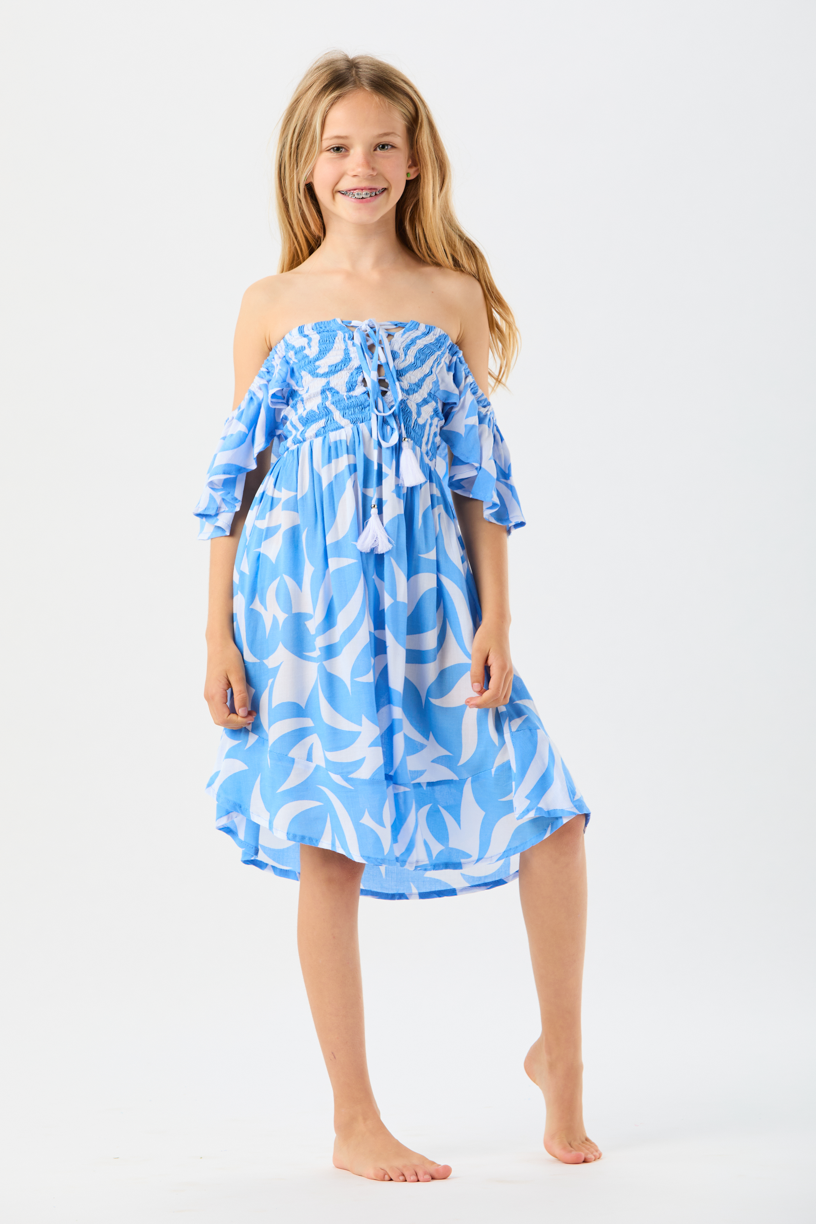 Let your little one shine where sweet details and playful design meet. Featuring a smocked lace-front bodice, this dress offers a flattering fit and a touch of vintage-inspired elegance. Delicate shell and tassel details on the ties add an extra hint of whimsy, while the ruffle hem creates a fun, twirl-worthy finish. Match mom with the Happiness Mini Dress!
