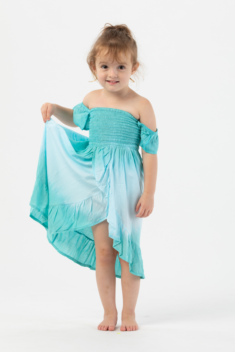 The highlight of the Kids Kohala Dress is its whimsical off-the-shoulder flutter sleeves, adding a touch of elegance and grace to your child's ensemble. The delicate flutter sleeves can be worn on or off the shoulder depending on preference, creating a beautiful silhouette that's both fashionable and fun, perfect for twirling and dancing the day away.