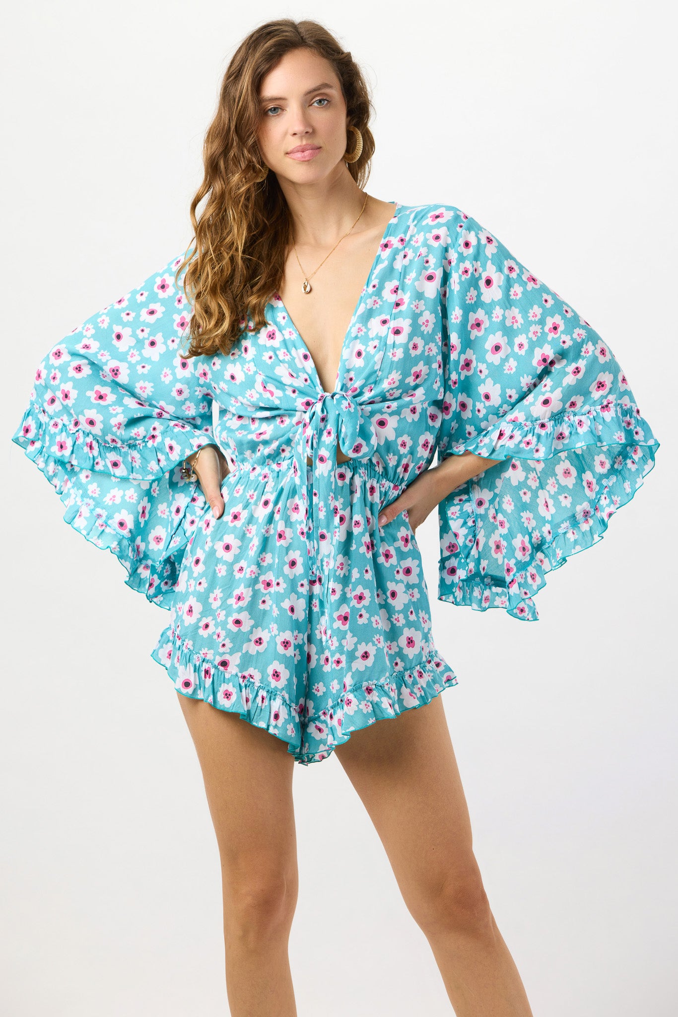 Features: Unlined, Deep V- neckline with ties back for adjustable fit, ¾ Bell Sleeves, Relaxed ruffle at shorts hem